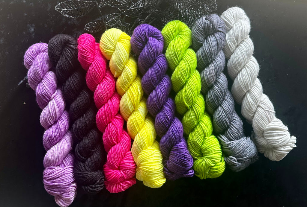 One full skein of 80% Superwash Merino and 20% Nylon Fingering weight (400 yards) in Black and Sock minis (80 yards each) in the other colors.