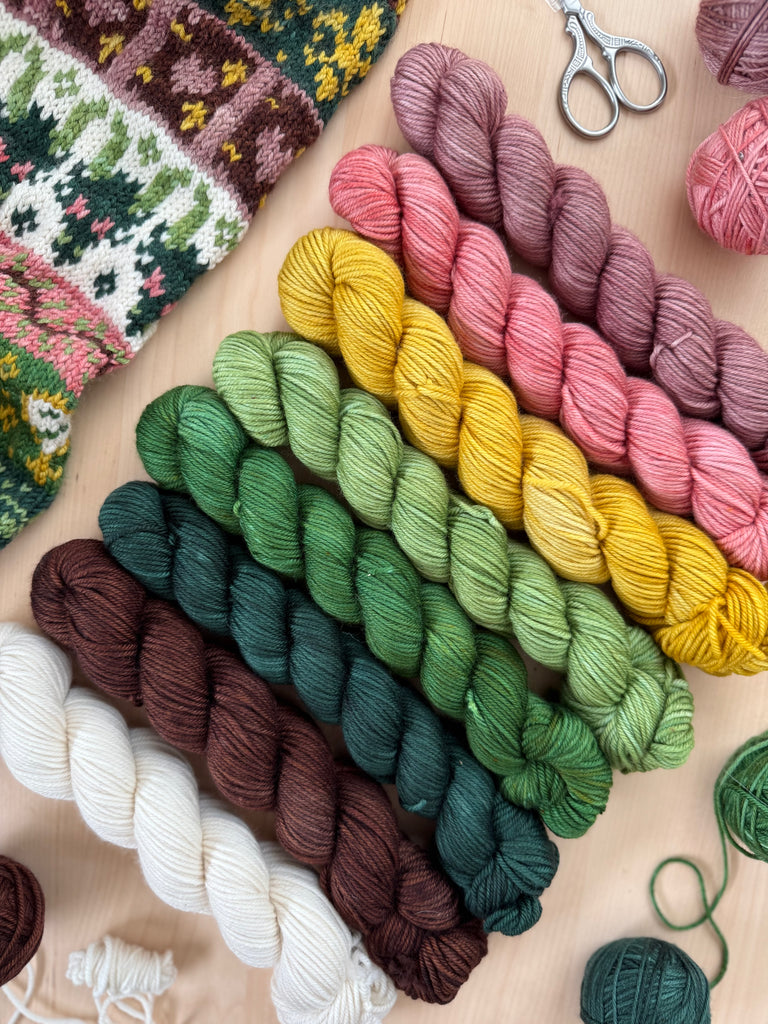 One full skein off 100% Superwash Merino DK (246 yards) in Black and seven DK Minis (49 yards each) in the other colors